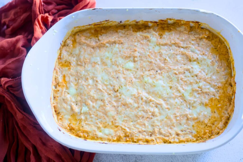 - Spread the mixture into a baking dish. Top with the remaining cheese. Bake at 350°F for 15 minutes until it’s bubbly and the cheese is melted.